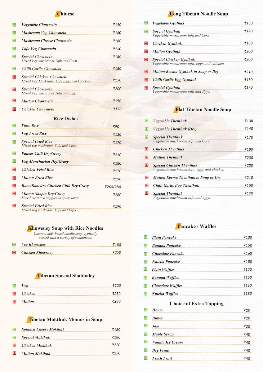 - Tibetan Noodles: The Flat Tibetan Noodle Soup is a highlight, ranging from vegetarian Thenthuk at ₹130 to the rich Mutton Keema variant at ₹210.